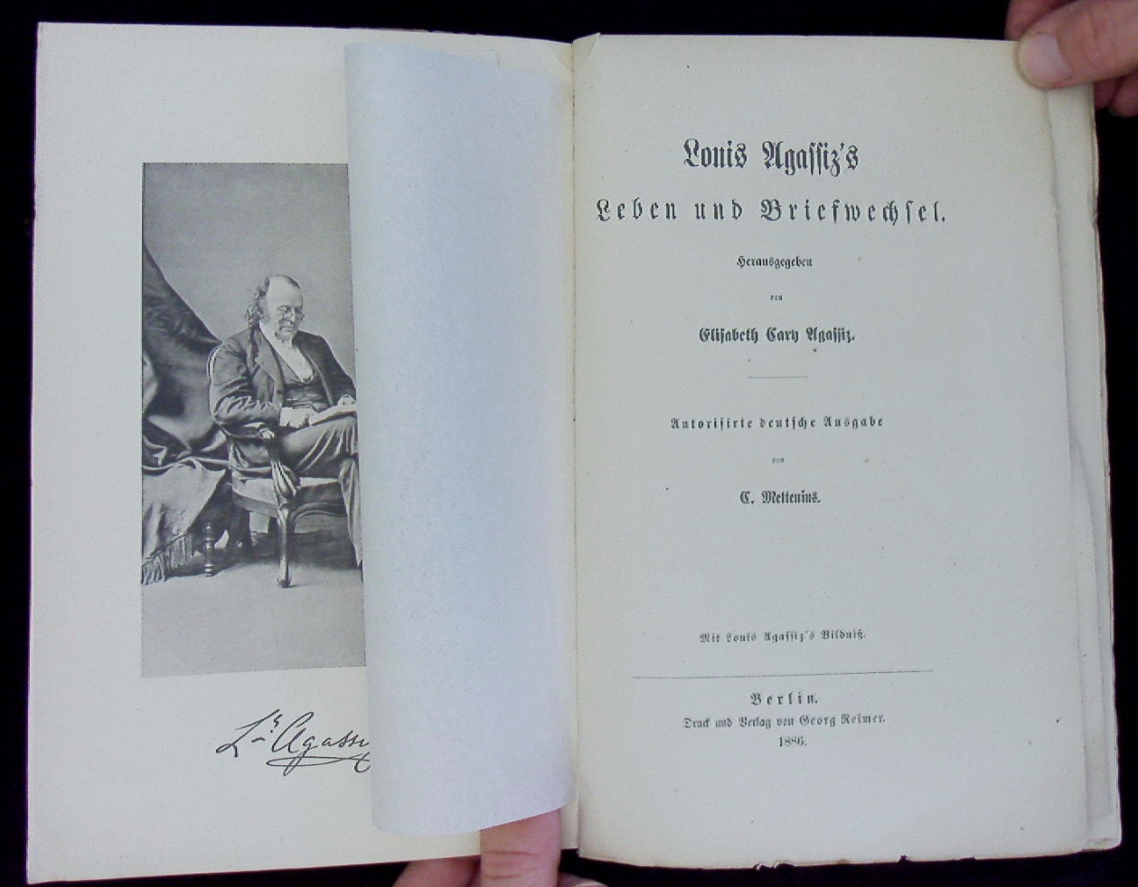 WISSENSCHAFT.– AGASSIZ, Elizabeth Cary: Louis Agassiz’s Leben und Briefwechsel. Hrsg. von Elisabeth Cary Agassiz. Autorisirte deutsche Ausg. von C. Mettenius. Berlin, G. Reimer, 1886. Gr. 8°. X, 448 S. mit Louis Agassiz’s Bildniss. OBr. Einband an den Kanten ewas lädiert, iien unaufgeschntiten. dt. EA. Jean Louis Rodolphe Agassiz (* 28. Mai 1807 in Môtier, Kanton Freiburg, Schweiz; † 14. Dezember 1873 in Cambridge, Massachusetts, Vereinigte Staaten) war ein schweizerisch-amerikanischer Naturforscher. Er war einer der ersten international renommierten US-amerikanischen Wissenschaftler. Nachhaltig sind vor allem seine Leistungen als Zoologe, insbesondere in der Ichthyologie, und als Hochschullehrer und seine Untersuchung der Gletscher der Alpen. In neuerer Zeit werden Agassiz’ Ansichten über Rassen beim Menschen kritisch gesehen. (Wikipedia)