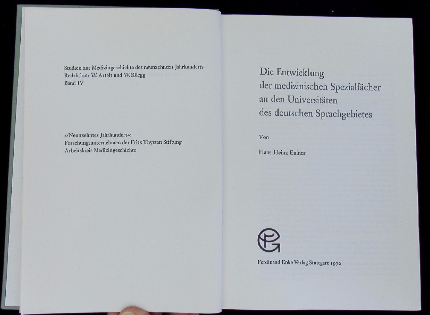 MEDIZIN.– EULNER, Hans-Heinz: Die Entwicklung der medizinischen Spezialfächer an den Universitäten des deutschen Sprachgebietes. Stuttgart (Enke) 1970. Gr. 8°. V, 721 S. OLn mit goldgeprägtem Rücken. feines Ex. = Studien zur Medizingeschichte des neunzehnten Jahrhunderts, Bd. 4. seltene EA. Umfassende medizinhistorische Darstellung in Form einer vergleichenden Fakultäts- und Fachgeschichte der deutschsprachigen Universitäten; das erste Werk seiner Art. (Söhn)