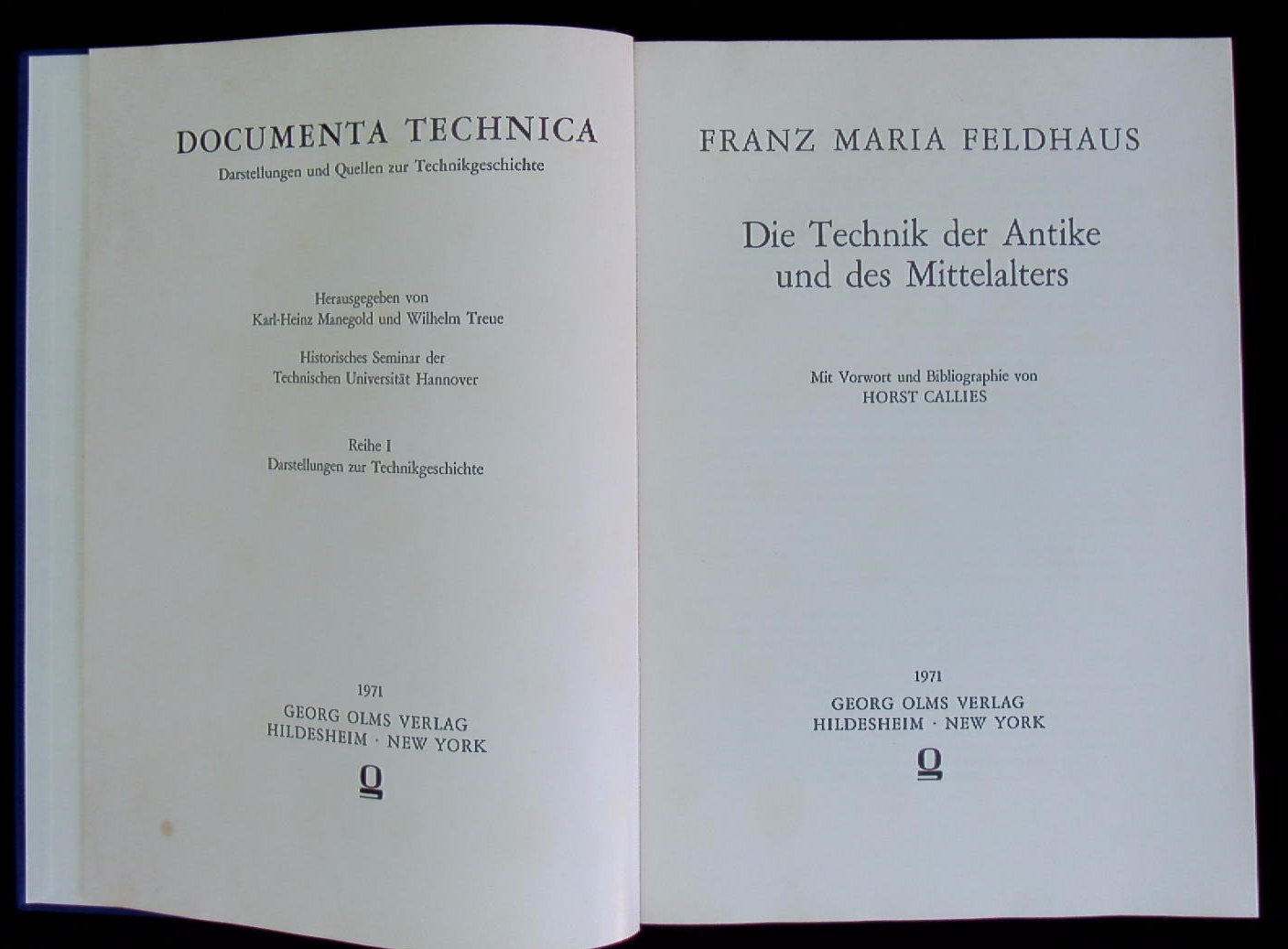 TECHNIK.– FELDHAUS, Franz Maria: Die Technik der Antike und des Mittelalters. Mit Bibliographie von Horst Callies. Reprogr. Nachdr. d. Ausg. Potsdam 1930. Hildesheim (Olms), 1971. 4°. XI, 442 S. mit zahl. Abb. OLn. Vorsätze mit Klebespuren. = Documenta technica, Reihe 1.