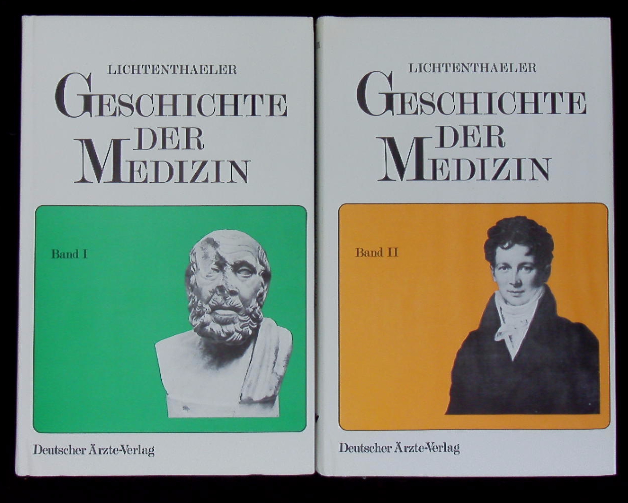 MEDIZIN.– LICHTENTHAELER, Charles: Geschichte der Medizin. Ein Lehrbuch für Studenten, Ärzte, Historiker und geschichtlich Interessierte. 2 Bände. Köln-Lövenich (Deutscher Ärzte), 1974/75. 736 S. mit zahlr. Abb. OLn mit OUmschl. feines Ex. EA