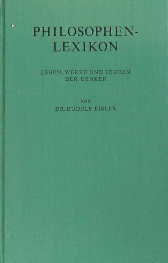 LEXIKA- EISLER, Rudolf: Philosophen-Lexikon. Leben, Werke und Lehren der Denker. Neudruck d. Ausg. Berlin 1912. Würzburg (Jal-reprint), 1972. V, 889 S. OLn. Vorsätze kaum fleckig.