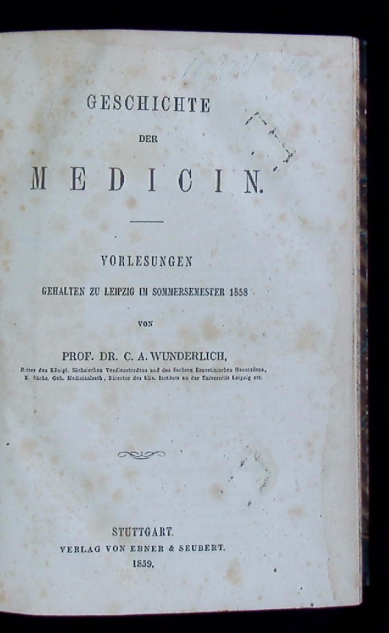 MEDIZIN.– WUNDERLICH, Karl Reinhold August: Geschichte der Medicin. Vorlesungen gehalten zu Leipzig im Sommersemester 1858. Stuttgart (Ebner & Seubert), 1859. VI, 366, 98, X S. OHLn mit goldgeprägtem Rückenschild. anfangs und am Ende stärker stockfleckig. EA.