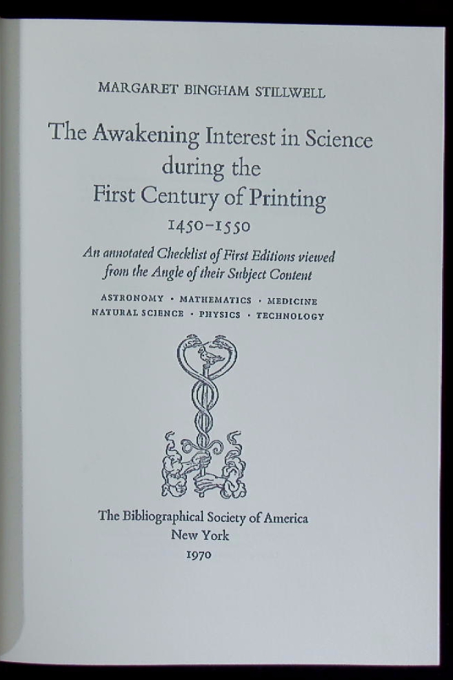 INKUNABELN.– STILLWELL, Margaret Bingham: The awakening interest in science during the first century of printing, 1450-1550. An annotated checklist of first editions viewed from the angle of their subject content: Astronomy, mathematics, medicine, natural science, physics, technology. New York (Bibliographical Society of America), 1970. 4°. XXIX, 399 Seiten. OLn. Vorsätze etwas angeschmutzt, sonst gut erhalten. EA.
