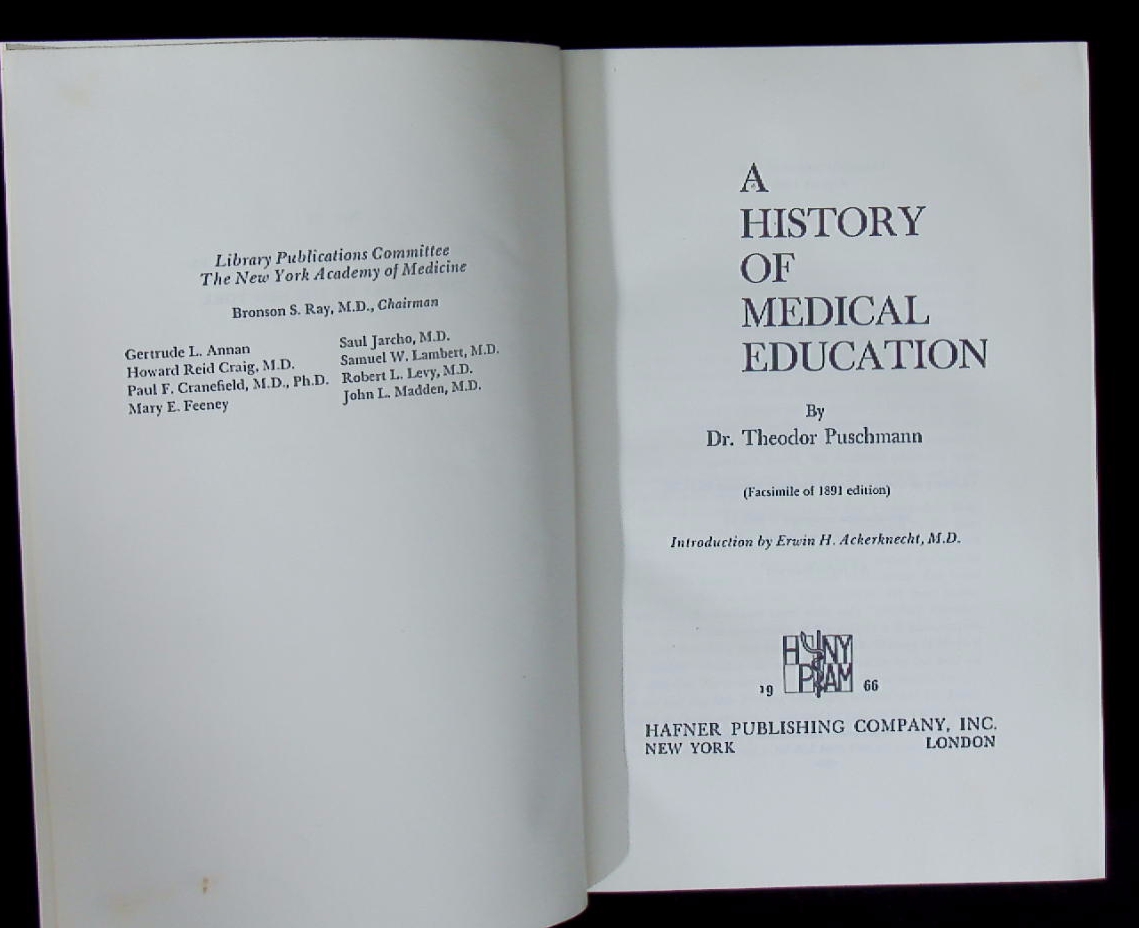 MEDIZIN.– PUSCHMANN, Theodor: A history of medical education. Facs. of 1891 ed. New York (afner), 1966. XI, 650 S. OLdr. Vorsaätze leicht fleckig. = The history of medicine series, 28. Theodor Puschmann studierte Medizin an den Universitäten zu Berlin, Marburg, Wien und München. In Marburg wurde er 1869 zum Dr. med. promoviert. Er vertiefte seine Studien durch Forschungsaufenthalte in England, Frankreich und Italien und lebte ein Jahr als Arzt in Ägypten und praktizierte in Kairo. Während des Deutsch-Französischen Kriegs 1870/71 diente er als Arzt in einem Reservelazarett. Anschließend absolvierte er in München die medizinische Staatsprüfung und praktizierte ein Jahr lang in Wien. 1872 ließ er sich als praktischer Arzt in München nieder und wandte sich unter dem Einfluss von Bernhard von Gudden der Psychiatrie zu.