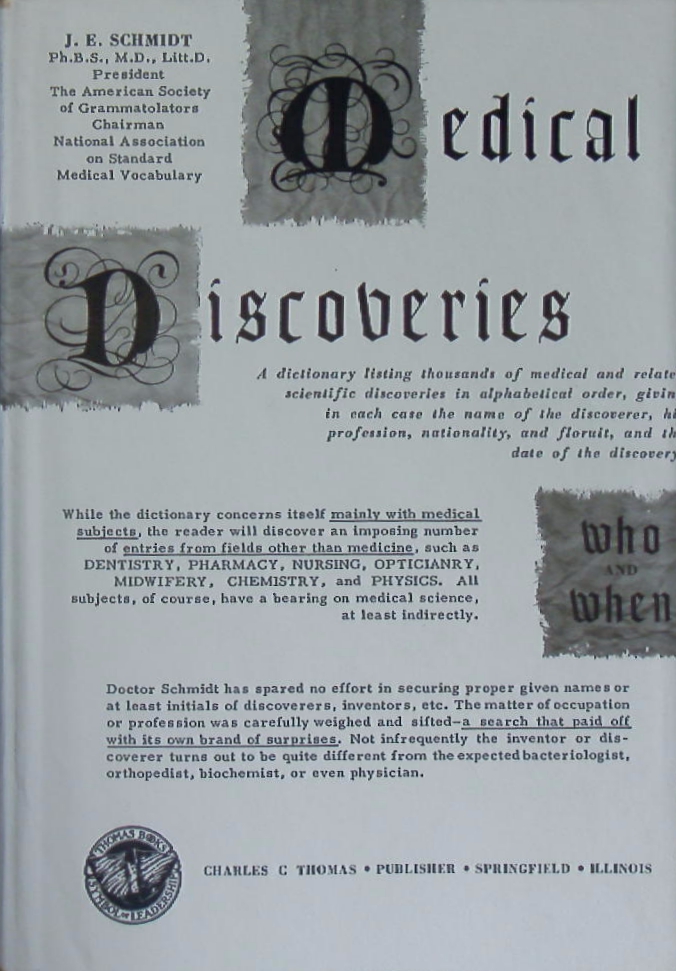 MEDIZIN.– SCHMIDT, Jacob Edward: Medical discoveries. Who and when. A dictionary listing thousands of medical and related scientific discoveries in alphabetical order, giving in each case the name of the discoverer, his profession, nationality, and floruit, and the date of the discovery. Springfield (Thomas), 1959. Gr. 8°. IX, 555 S. OLn mit OUmschl. Vorsätze mit Kleberesten, sonst sehr gut. EA.