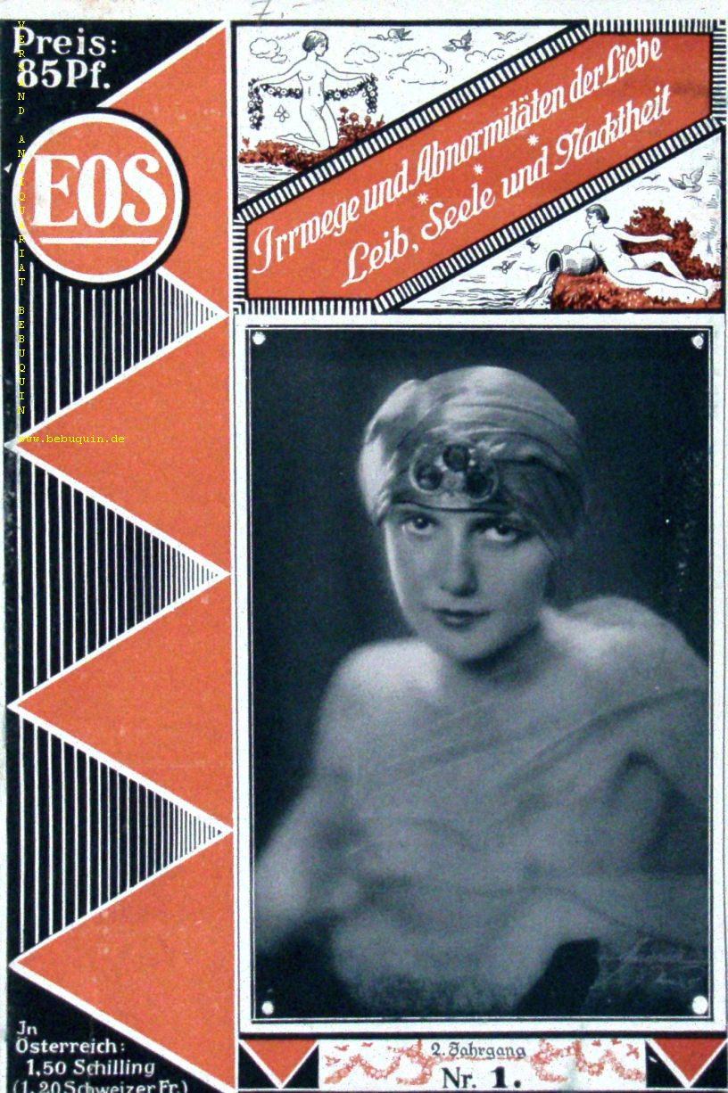 FKK.– EOS.– 2 Jg. Nr. 1. Zeitschrift für natürliche Schönheit im Alltag, in Liebe u. Ehe, Bühne und Kunst. Hrsg. von Th. Walther Weiß. Mit reichen Bild- und Textbeigaben sowie der Beilage „Bühne und Leben“. Göttingen (EOS), 1928. Gr. 8. S. 215 – 246 mit 16 fotografischen Bildtafeln mit unbekleideten Menschen. farb. ill. OBr. Einband mit kleinem Einriss, sonst gutes Ex. Sehr seltene Zeitschrift.