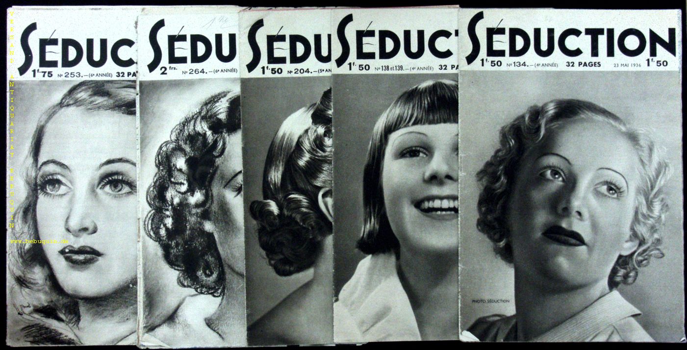 EROTIK.– SEDUCTION.– 5 Nummern der erotischen Zeitschrift. Nr. 134,138/39, 204, 253, 264. Sceaux, 1936 – 38. Gr. 8°. je 32 S. mit zahlr. teils fotografischen Bildern unbekleideter Frauen. ill. OBr. Kanten etwas bestoßen, sonst gutes Ex. EA.