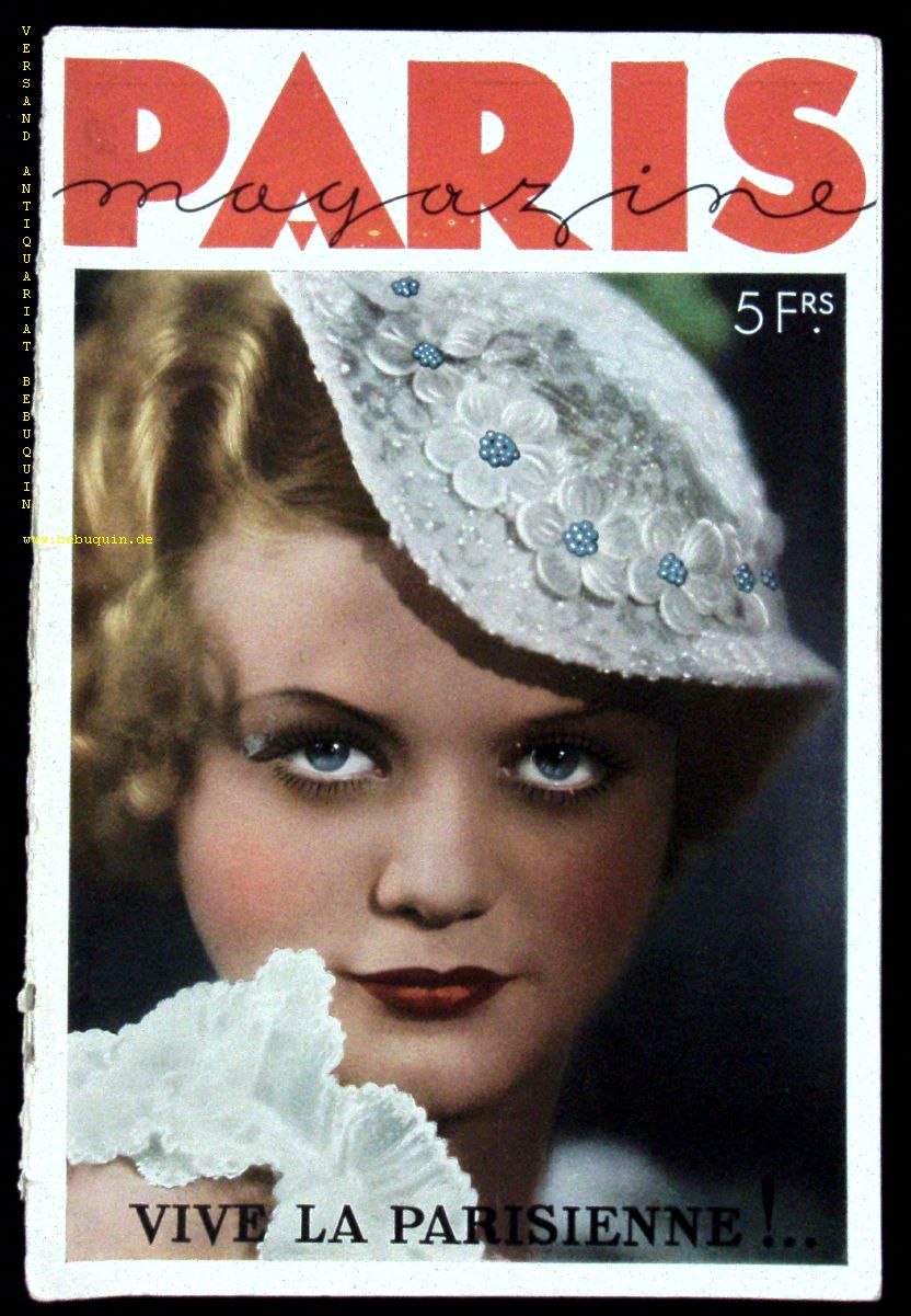 EROTIK.– PARIS MAGAZINE.– 1935. No. 42. Revue mensuelle. Paris (Rue de Ponceau), 1935. 4°. ca 60 S. mit zahlr. fotografischen Bildern von zumeist unbekleideten Menschen. farb. ill. OKart. gutes Ex. EA.