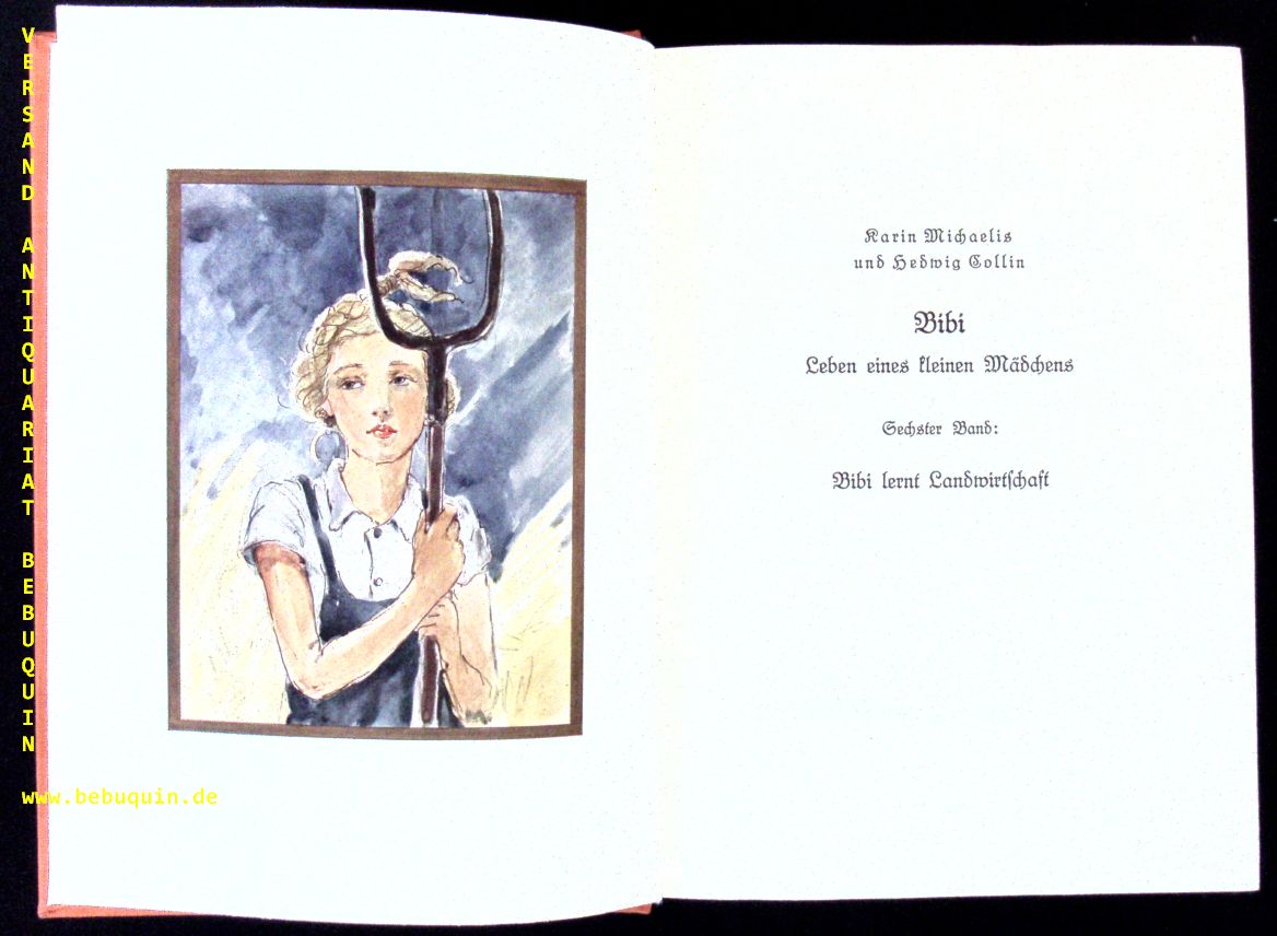 MICHAELIS, Karin: Bibi lernt Labdwirtschaft. Zürich (Rascher), 1938. 292 S. mit farb. Titelbild + vielen Zeichnungen von Hedwig Collin. OLn. gutes Ex. = Bibi, Bd. 6. EA.