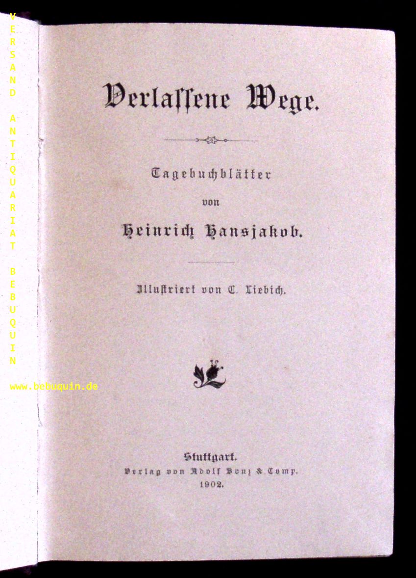HANSJAKOB, Heinrich: Verlassene Wege. Tagebuchblätter. Stuttgart (Bonz & Comp.), 1902. kl. 8°. 412 (4) S. mit Ill. von C. Liebich. Hldr der Zeit mit goldgeprägtem Rücken. gutes Ex. 1. Aufl. dieser Ausgabe.