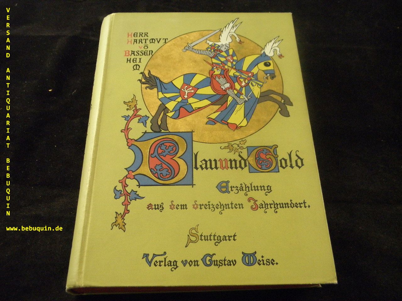 WIENER, Bernhard: Blau und Gold. Erzählung aus dem 13. Jahrhundert für die reifere Jugend. Stuttgart (Weise), (1896). Gr. 8°. 232 S. mit 6 farb. Bildern von Ad. Cloß. reich verziertes farb. OLn. NaV, kaum gelockert, eines Ex. EA. Klotz 8245/1.