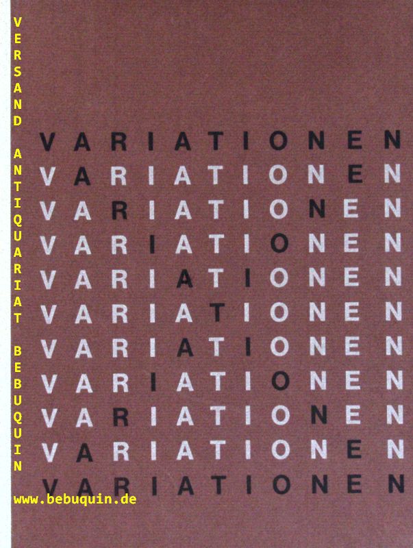 WEISSBRODT, Werner: (Hrsg.) Variationen. Auenheim (Ross), 1967. 4°. 24 Bl. mit 21 farb. Bildtafeln nach den Illustrationen von Werner Weißbrodt in der Festschrift zur Einweihung des Kreiskrankenhauses in Bretten. ill. OHLn von Hildegard Ernst. tadellos. Nr. 15 von 20 numerierten und mit einer eigenhändigen signierten Widmung Weissbrodts versehenen Ex. der einmaligen Ausgabe. Eine Rarität. Werner Weißbrodt wurde 1928 in Hockenheim geboren. Er studierte an der Freien Akademie Mannheim und an der Akademie der Bildenden Künste (ABK) Karlsruhe. Während seiner Studienzeit gewann er 1951 einen Plakatwettbewerb für die Olympischen Spiele in Helsinki und 1952 den Wettbewerb „Das internationale Plakat“ in Karlsruhe. Seine berufliche Laufbahn begann er beim Landesgewerbeamt Baden-Württemberg in Karlsruhe. Dort konzipierte er Ausstellungen und übernahm die Redaktion der Zeitschrift Werkkunst. Nach einem Lehrauftrag an der Karlsruher Akademie für bildende Künste und an der damaligen Pforzheimer Staatlichen Kunst- und Werkschule für Oberflächengestaltung Anfang der 1960er Jahre erhielt er 1973 eine Professur an der Fachhochschule für Gestaltung Pforzheim. (Wikipedia)