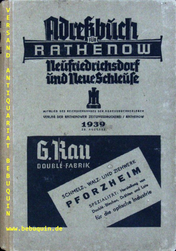 RATHENOW.– ADRESSBUCH FÜR RATHENOW 1939.– Neufriedrichsdorf und neue Schleuse. Nach amtlichen Quellen bearb. von Heydekorn. Rathenow (Zeitungsdruckerei), 1939. Gr. 8°. X, 34, 256, 170, 60 S. mit Zwischenpappen. ill. OHLn. letzte Seite mit Einriss, sonst sehr gut erhalten. sehr seltenes Adressbuch.