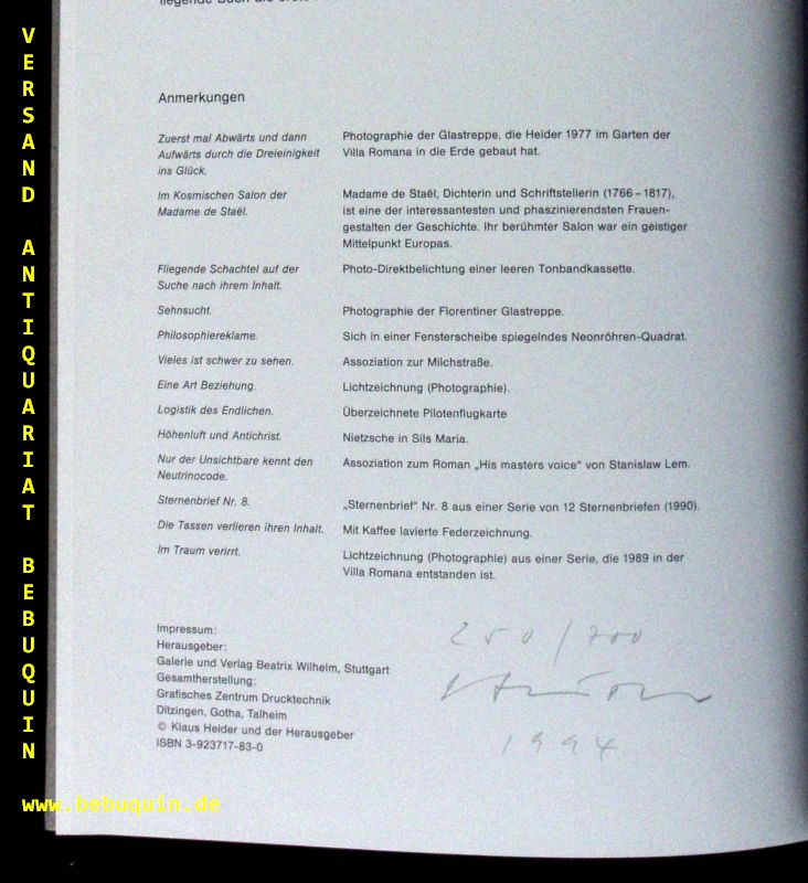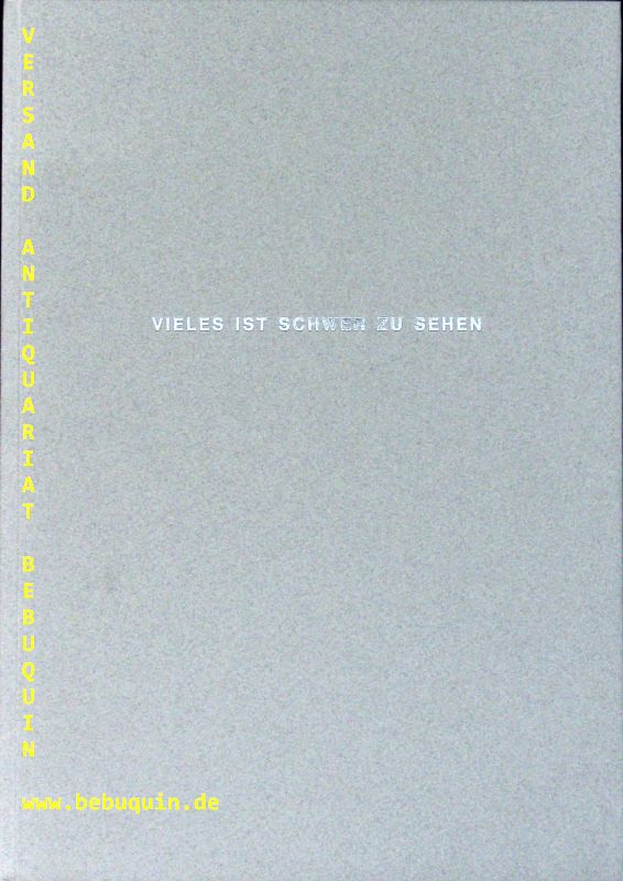 HEIDER, Klaus: Vieles ist schwer zu sehen. Stuttgart (Wilhelm), 1994. 4°. 82 S. mit zahlr. teils farb. teils mont. Bildtafeln. OPb. tadelllos. Nr. 250 von 700 nummerierten und sinierten Ex. der EA. Beigegeben einige handschriftliche Briefe des Künstlers. Klaus Heider (* 25. Oktober 1936 in Göppingen; † 28. Oktober 2013 in Stuttgart) war ein deutscher Grafiker, Maler, Fotograf, Installations- und Objektkünstler sowie Hochschullehrer. (Wikipedia)