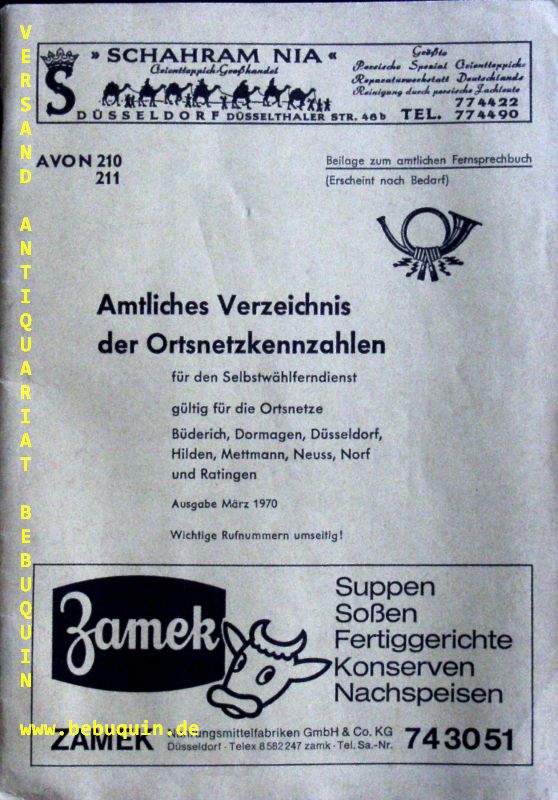 DÜSSELDORF.– AMTLICHES VERZEICHNIS DER ORTSNETZKENNZAHLEN.– Für den Selbstwählferndienst. Gültig für die Ortsnetze Büderich, Dormagen, Düsseldorf, Hilden, Mettmann, Neuss, Norf und Ratingen. Ausgabe März 1970. Düsseldorf, 1970. 52 S. ill. OKart.