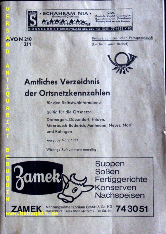 DÜSSELDORF.– AMTLICHES VERZEICHNIS DER ORTSNETZKENNZAHLEN.– Für den Selbstwählferndienst. Gültig für die Ortsnetze Büderich, Dormagen, Düsseldorf, Hilden, Mettmann, Neuss, Norf und Ratingen. Ausgabe März 1972. Düsseldorf, 1970. 56 S. ill. OKart.