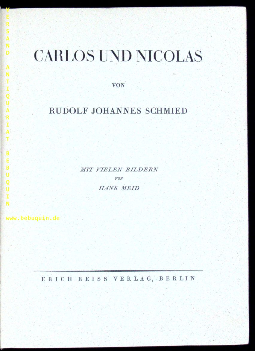 MEID.– SCHMIED, Rudolf Johannes: Carlos und Nicolas. Berlin (Reiss), 1930. Gr. 8°. 251 S. mit vielen Illustrationen von Hans Meid. ill. OLn. etwas bestaubt. 1. Aufl. dieser Ausgabe.