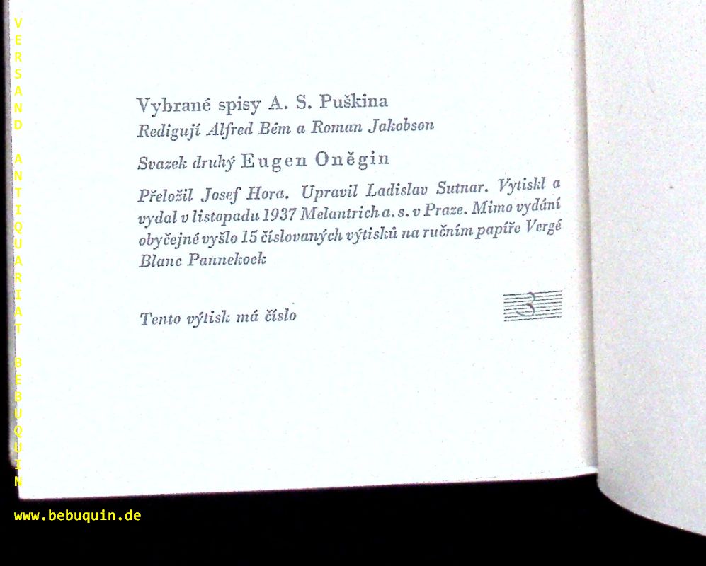 PUSKIN, Aleksandr Sergeevic: Eugen Onegin. Román ve verších. Tschechisch v.Josef Hora. V Praze (Melantrich), 1937. 264 S. OPrgt mit reicher Goldprägung. kaum angeschmutzt. Nr. 3 von 15 Ex. dieser Prachtausgabe und tschecischen EA.