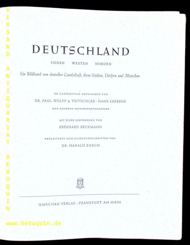 WOLFF, Paul + TRITSCHLER + SAEBENS, Hans: Deutschland, Süden, Westen, Norden. Ein Bildbd. von dt. Landschaft, ihren Städten, Dörfern u. Menschen. 4. Aufl. Frankfurt am Main (Umschau), 1950. XXXVI, 200 ganzseitige Aufnahmen OLn. Einband stärker bestaubt.