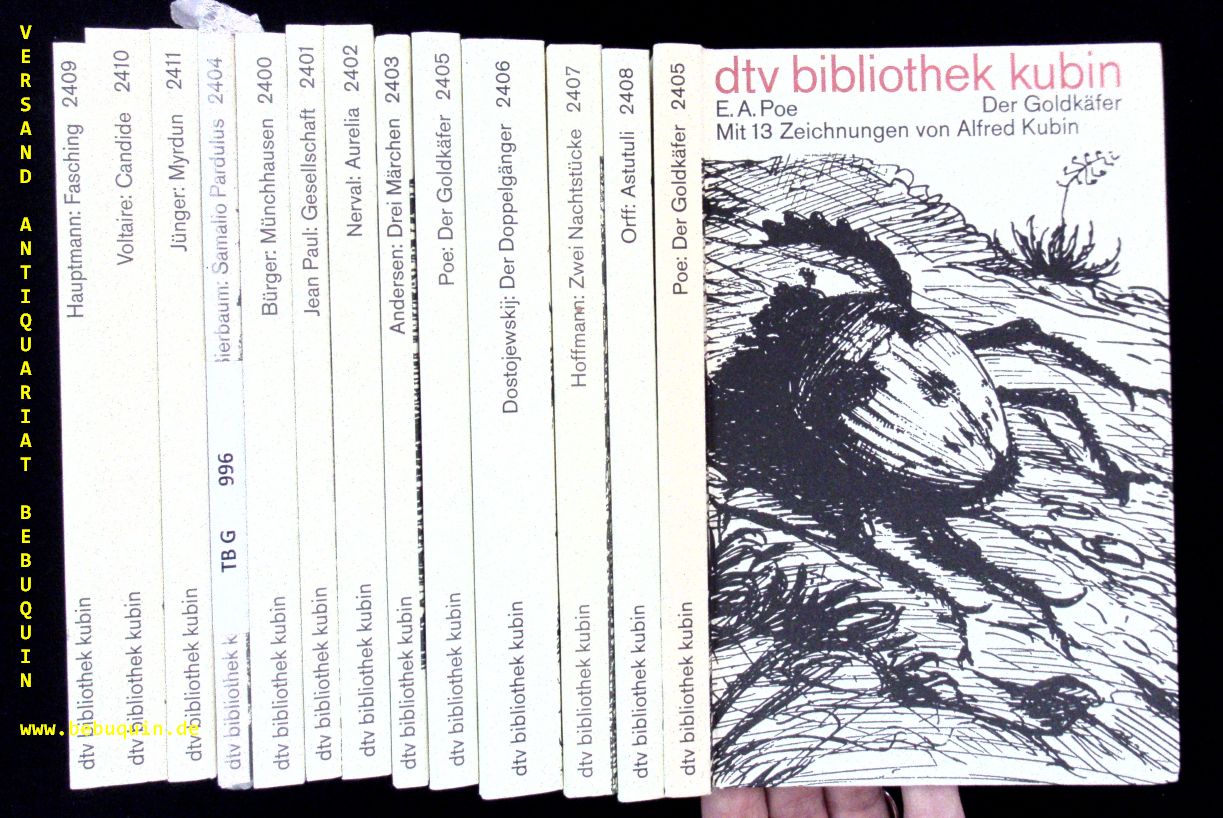 KUBIN.– DTV BIBLIOTHEK KUBIN.– 12 Bände. Bürger: Münchhausen. Jean Paul: Die wunderbare Gesellschaft. Nerval: Aurelia. Amndersen: Drei Märchen. Bierbaum: Samalio Pardulus. Poe: Der Goldkäfer. Dostojewskij: Der Doppelgänger. Hoffmann: Zwei Nachtstücke. Orff: Astutuli. Hauptmann: Fasching. Voltaire: Candide. Jünger: Myrdun. 12 Bände. München (dtv), 1980. je ca 50 S. mit zahlr. Zeichnungen von Alfred Kubin. ill. OPb. tadellos. komplette Reihe.