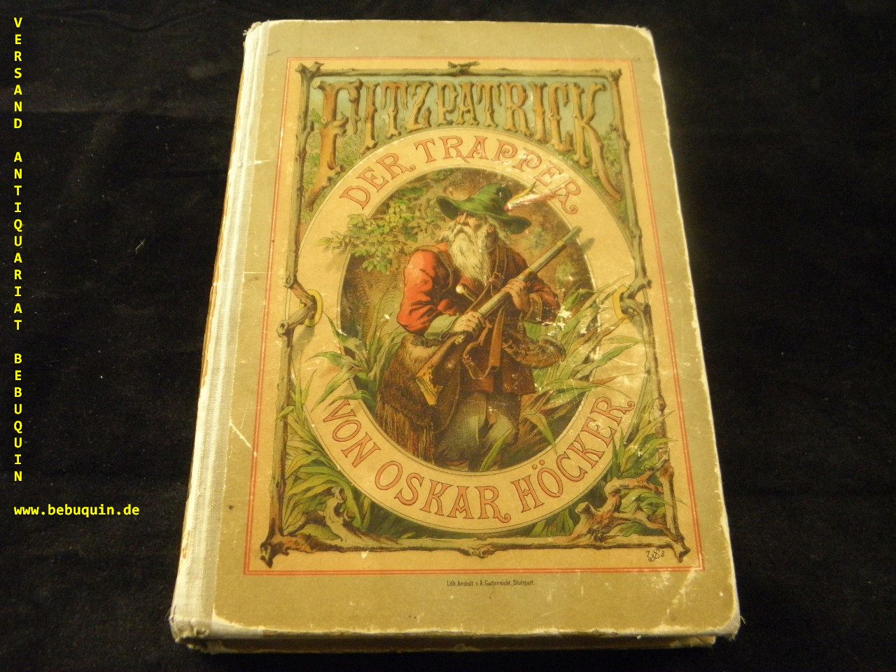 HÖCKER, Oskar: Fitzpatrick, der Trapper. Erzählung aus dem Felsengebirge und den Prairien Nordamerika’s. Stuttgart (Barth), ca 1900. IV, 272 S. mit 8 Bildern in Farbendruck. farb. ill. OHLn. Deckel etwas bekratzt, Vorsätze erneuert, gutes Ex. vergl. Klotz 2729/42.
