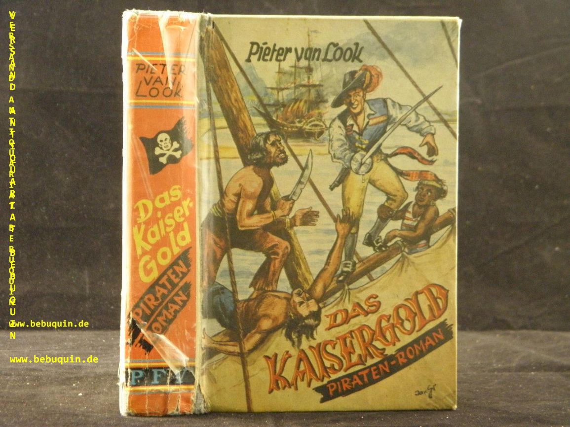 LOOK, Pieter van: Kaisergold. Seepiraten-Roman. Marl-Hüls (Feldmann), ca 1955. 272 S. farb. ill. OSupronyl. Cellophan teils abgeblättert, gestempeltes Leihbuch. EA.