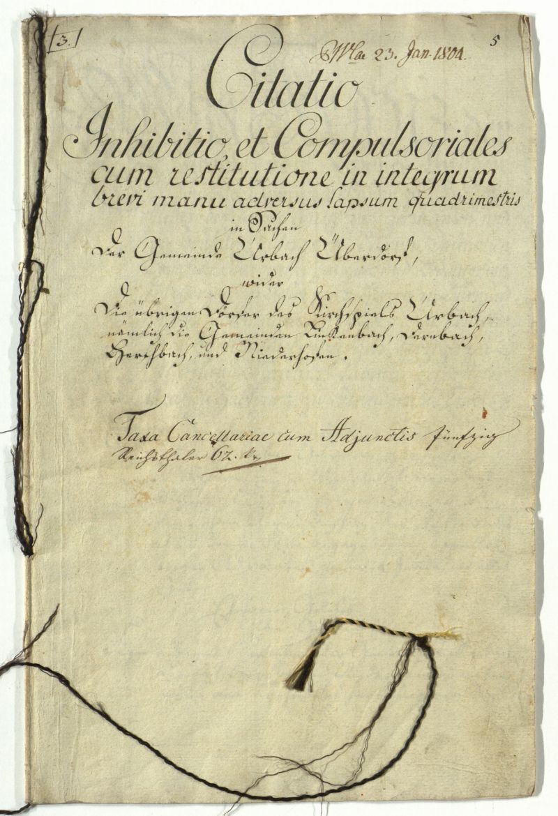 HESSEN.– REICHSKAMMERGERICHT WETZLAR.– Dreifach signierte Vorladung in einer Streitsache der Gemeinde Urbach gegen Nachbargemeinden. Wetzlar, 13.12.1803. 31 x 20 cm. 10 S. auf drei Doppelbogen Hadernbütten mit Siegelrest und großem detailreichen Wasserzeichen, gedruckter Kopf. links mit schwarzgelbem Faden geheftet. Das Reichskammergericht war eine der wenigen funktionierenden Institutionen des Heiligen Römischen Reichs. Die Prozesse waren zwar äußerst langwierig, schützten aber kleinere Herren gegen die Gelüste der großen Staaten. Es stellte erst 1806 mit dem Ende des Heiligen Römisches Reiches seine Arbeit ein. Transkription: