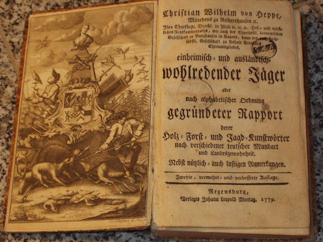 JAGD.– HEPPE, Christian Wilhelm von: Einheimisch- und ausländisch-wohlredender Jäger oder nach alphabetischer Ordnung gegründeter Rapport derer Holz- Forst- und Jagd-Kunstwörter nach verschiedener teutscher Mundart und Landesgewohnheit. Nebst nützlich- auch lustigen Anmerkungen. Zweyte, vermehrt- und verbesserte Aufl. Regensburg (Johann Leopold Montag), 1779. Gr. 8°. 7 Bl., 428 S. + 1 Bl. Druckfehlerberichtigung mit ganzseitigem Titelkupfer mit Wappen eine Jagdszene darstellend. Pb. der Zeit. Einbandkanten angeplatzt, vorderes Gelenk etwas gelockert, minmale Läsur des Titelkupfers mit kleinem Papierstreifen hinterlegt, insgesamt von sehr ansprechender Erhaltung. Heppe (1716-1791) war Forstinspektor zu Freihüls und Freidenberg. Bedeutendes Forst- und Jagdwörterbuch mit teils ausführlichen, kulturgeschichtlich wertvollen Anmerkungen. Lindner schreibt in Dt. Jagdschriftsteller, 208: ″ Christian Wilhelm von Heppe gewann als Jagdschriftsteller stärkeren Einfluß als sein Vater Carl. Sein einziges Werk, der Wohlredende Jäger, ist noch immer ein wertvolles und zuverlässiges Nachschlagewerk mit klaren und originellen Angaben.“