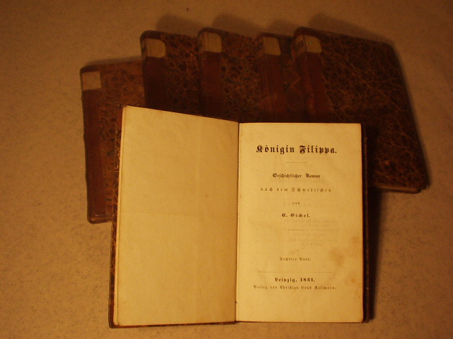 STALBERG, Wilhelmina: Königin Filippa. Geschichtlicher Roman nach dem Schwedischen. D.v. C. Eichel. 6 Bände. Leipzig (Kollmann), 1850/51. kl. 8°. ca 1000 S. HLdr der Zeit. Einbände etwas abgegriffen, innen leicht fingerspurig, Leihbibl.-Ex. dt. EA.