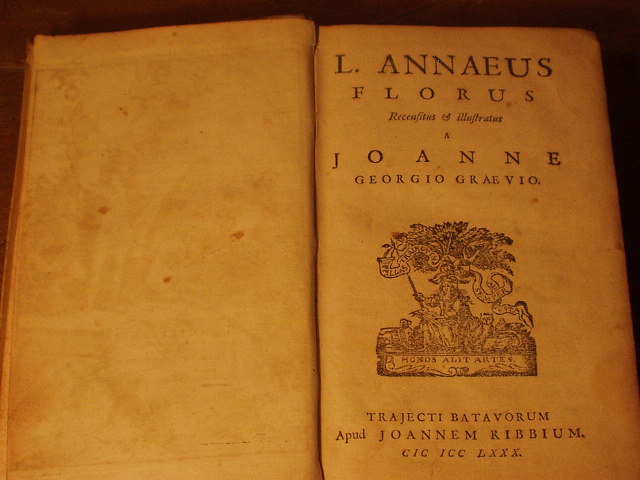 GRAEVIUS, Johann Georg: L. Annaeus Florus Recensitus & illustratus. Animadversiones in l’Annaei Flori. Utrecht (Joannem Ribbium), 1680. 15 Bl., 202, 180 S. 61 Bl. mit ganzseitigem Titelkupfer von R. de Hooghe, sehr vielen feinen Textholzschnitten (meist Münzdarstellungen mit Herrscherportraits) und einer Falttafel in Rot- und Schwarzdruck „Columna Rostrata a Ciacconia suppleta“. Pergamenteinband der Zeit mit gemalter Rückenverzierung. Einband etwas angeschmutzt, altersgemäß gut erhalten. EA des bedeutenden Juristen und Philologen. Graevius genoss einen sehr guten Ruf als Lehrer, sein Vorlesungsraum war von Studenten überlaufen, viele von ihnen aus vornehmer Familie und aus allen Teilen der Welt. Er wurde von König Ludwig XIV von Frankreich geehrt und genoss die besondere Gunst von König Wilhelm III von England der ihn zum königlichen Geschichtsschreiber machte.