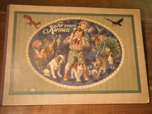 LECHLER, Cornelia: Für unsere Kleinen. Nürnberg (Jaser), ca 1910. Quer 4°. 12 Bl. mit 10 farb. Bildtafeln und zahlr.Textabb. von Hans Dorner. farb. ill. OHLn. Ecken leicht bestoßen, Heftung angerostet und gelockert, sonst gut erhalten. = Verlagsnummer 544. EA. Seltenes Bilderbuch mit zehn eindrucksvollen Kinderszenen in Chromolithographie. Es zeigt Kinder beim Spiel mit Tieren (im Zimmer mit Papageien, auf der Gartenmauer mit Hunden, im Garten mit Truthähnen, Fasanen, am See mit Schwänen und Störchen, beim Ausreiten, im Pferdestall mit Kaninchen, im Winter vor dem Gartentor beim Füttern der Rehe etc.).