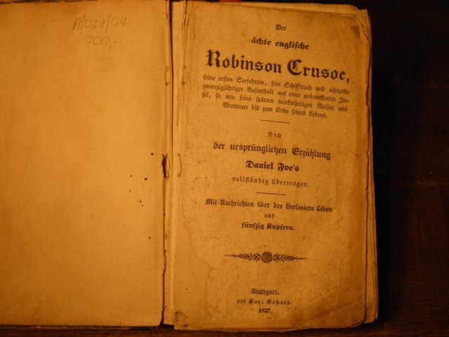 DEFOE, Daniel: (Hier Daniel Foe) Der ächte englische Robinson Crusoe. Seine ersten Seefahrten, sein Schiffbruch und achtundzwanzigjähriger Aufenthalt auf einer unbewohnten Insel, so wie seine späteren merkwürdigen Reisen und Abenteuer bis zum Ende seines Lebens. Nach der ursprünglichen Erzählung Daniel Foe’s vollständig übertragen. Mit Nachrichten über des Verfassers Leben. Stuttgart (Erhard), 1837. 664 (von 668) S. mit 46 (statt 50) Kupfertafeln. HLdr der Zeit. Einband stärker angeschmutzt und abgenutzt, Titelseite aufmontiert, zahlreiche Lagen lose oder gelockert, Tafeln teils am Rand stärker fingerfleckig, es fehlen die Textseiten 139/140 und 341/342, einige Seiten am Rand lädiert, 4 Kupfer fehlen. Seltene reich illustrierte Ausgabe. Mit großer Sorgfalt wurden die 50 Kupfertafeln gefertigt, jeweils mit einem unterschiedlichen figürlichen und fein gestochenen Rahmen. Hier leider in einem stark bespielten Ex.