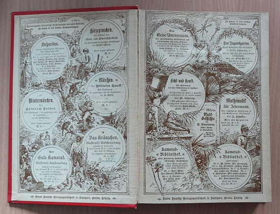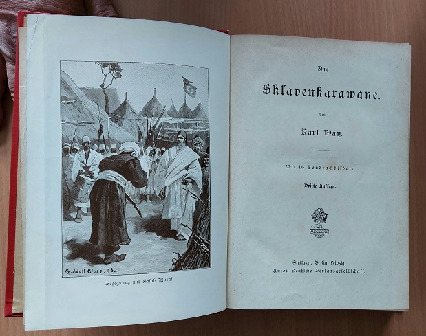 MAY, Karl: Die Slavenkarawane. 3. Aufl. Stuttgart (Union), 1901. Gr. 8°. 496 S. mit 16 Tondruckbildern von Gustav Adolf Closs und gestalteten Vorsätzen. farb. ill. OLn. (DB 17). oberes Kap. gering bestoßen, Ex libris auf Vorsatz, sonst sehr feines Ex. seltene frühe Ausgabe.Plaul 249.3.