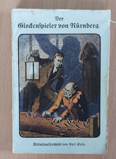 SOLO, Carl: Der Glockenspieler von Nürnberg. Kriminalroman. Reutlingen (Enßlin & Laiblin), 1909. 192 S. mit Bildern von R. Trache. farb. ill. OBr. von Arno Grimm. leichte Knickspur. = Ensslins interessante Bibliothek, 18. EA (Schädel 7179).