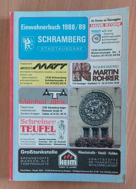 SCHRAMBERG.– EINWOHNERBUCH SCHRAMBERG 1988/89.– Stadtausgabe. Karlsruhe (KBK), 1988. Gr. 8°. 48, 429 S. mit zahlr. Abb. farb. ill. OKart. gutes Ex.