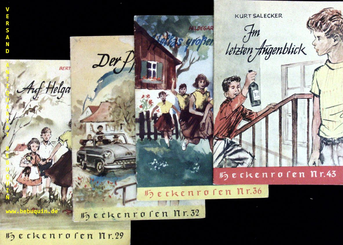 HECKENROSEN: 4 Hefte: Nr. 29 + 32 +36 + 43. Schmidt-Eller: Auf Helga ist Verlaß. Krug: Der Pfirsichkern. Krug: Hellas großer Fischzug. Salecker: Im letzten Augfenblock. 4 Bände. Wuppertal (Brockhaus), 1955 – 1960. je 16 S. mit zahlr. Abb. farb. ill. OKart. gute Ex. seltene Hefte der Reihe.