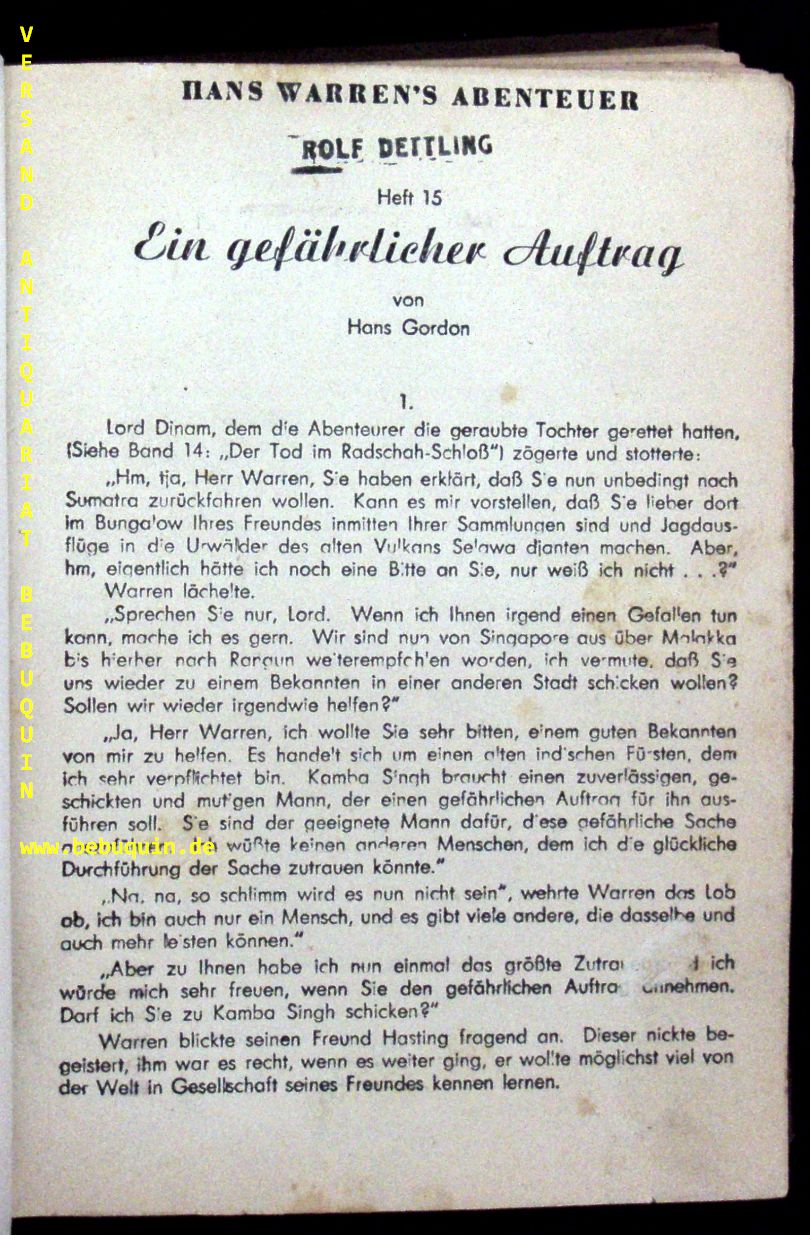 HANS WARRENS ABENTEUER.– GORDON, Hans: Heft 15 – 25. 10 Hefte in 1 Bd. Berlin (Pinguin), 1949. jeweils 32 S. HLdr der Zeit mit eingebundenen illustrierten Umschlägen Gelenke stark gelockert, Umschlagblatt von Heft 15 fehlt, sonst ordentlich erhalten. geschlossene Reihe von 10 Heften der gesuchten Romanhefte. Knüppel 158.