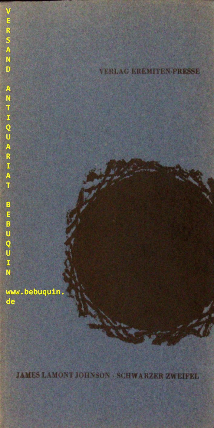 EREMITEN-PRESSE.– LAMONT JOHNSON, James: Schwarzer Zweifel. Gedichte. D.v. Uve Schmidt. Stierstadt im Taunus (Eremiten-Presse), 1961. Gr. 8°. 26 S. mit 4 Original-Linolschnitten von Sigurd Kuschnerus. ill. OKart. tadellos. Nr. 96 von 222 numerierten Ex der EA.