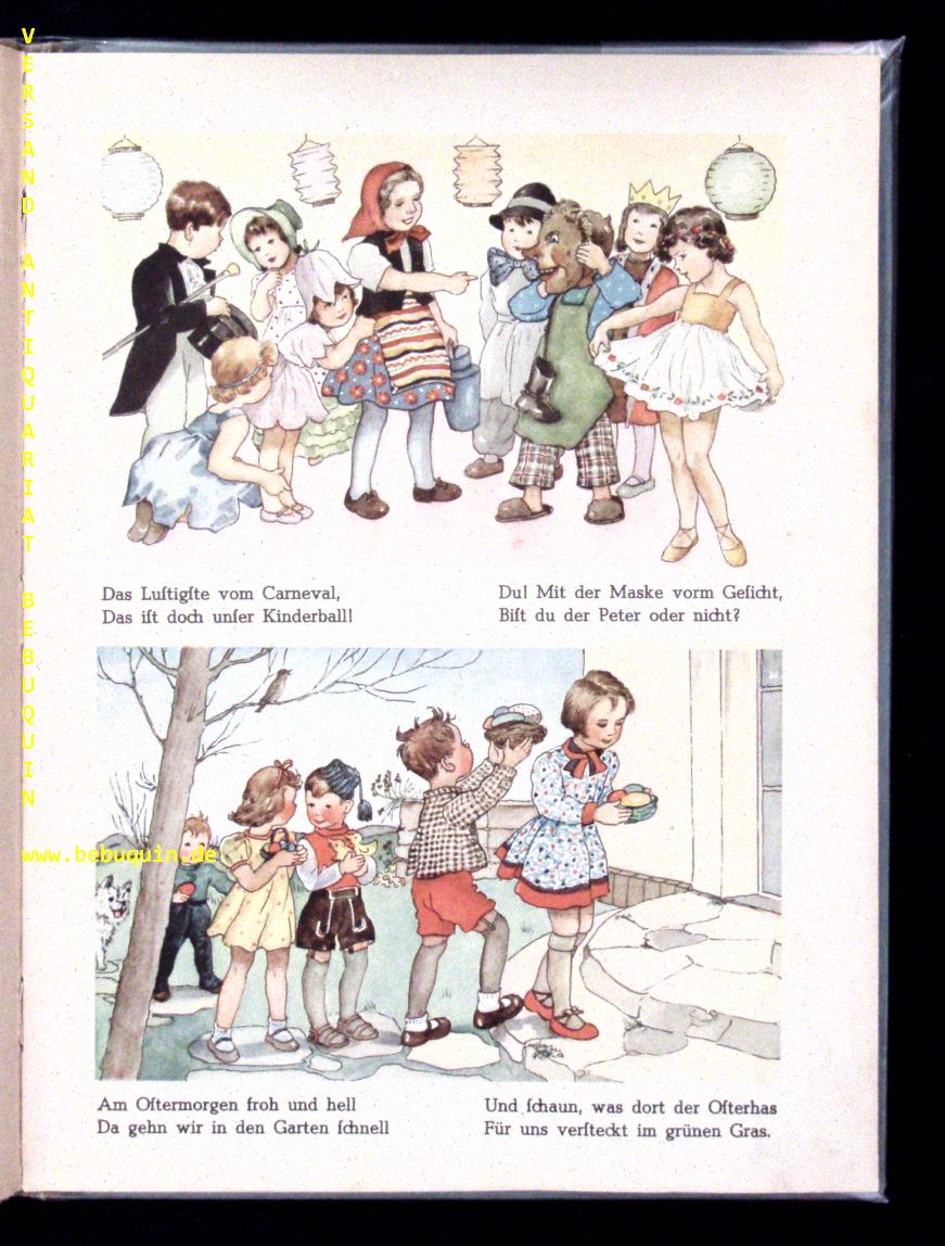 BEINTKER, Käte: Große Feste – kleine Feste. Unseren Lieblingen zur Freude. o.O. (o.Vlg.), ca 1945. Gr. 8°. 8 Bl. mit 8 farb. und 8 s/w Bildtafeln von Lotte Oldenburg-Wittig. farb. ill. OHLn. feines Ex. seltene EA. Klotz 356/3.