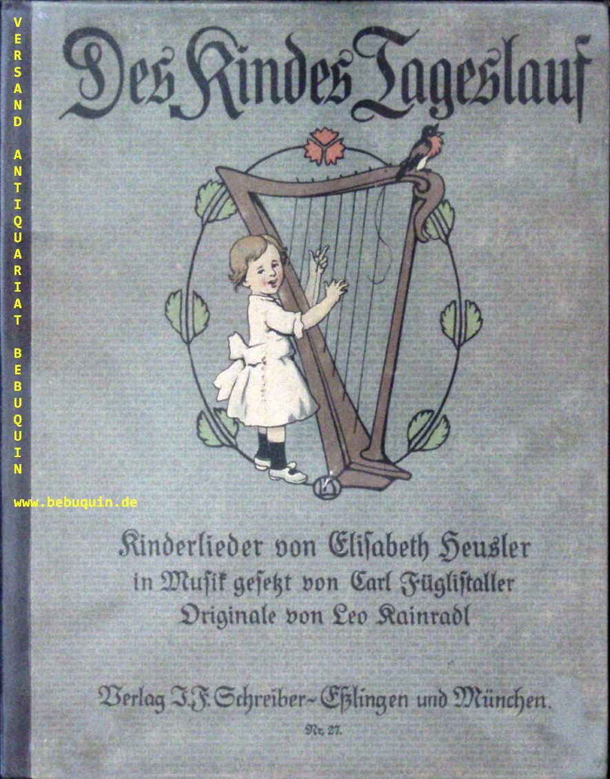 LIEDERBÜCHER.– HEUSLER, Elisabeth: Des Kindes Tageslauf. Kinderlieder. In Musik gesetzt von Carl Füglistaller. Eßlingen/München (Schreiber), 1911. Gr. 8°. 38 S. mit zahlr. farb. Originalen von Leo Kainradl. farb. ill. OHLn. Heftklammern leicht angerostet. EA.