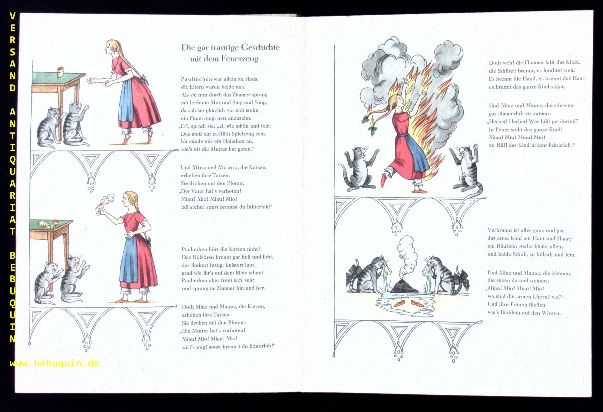 STRUWWELPETER.– HOFFMANN, Heinrich: Der Struwwelpeter. Nach der Urfassung neu gezeichnet und in Holz geschnitten. Frankfurt (R&L), 1938. 4°. 24 S. mit farb. Bildern von Fritz Kredel. ill. OHLn. Einband etwas braunfleckig. 1. Ausgabe mit diesen Illustrationen. Unzerreißbare Variante. Rühle 183b.