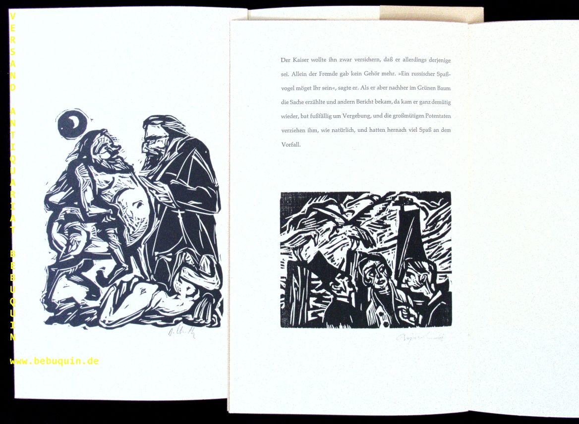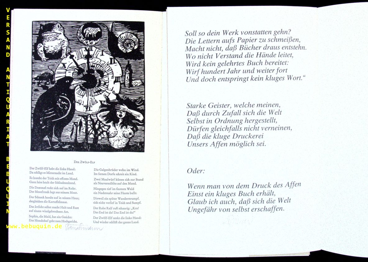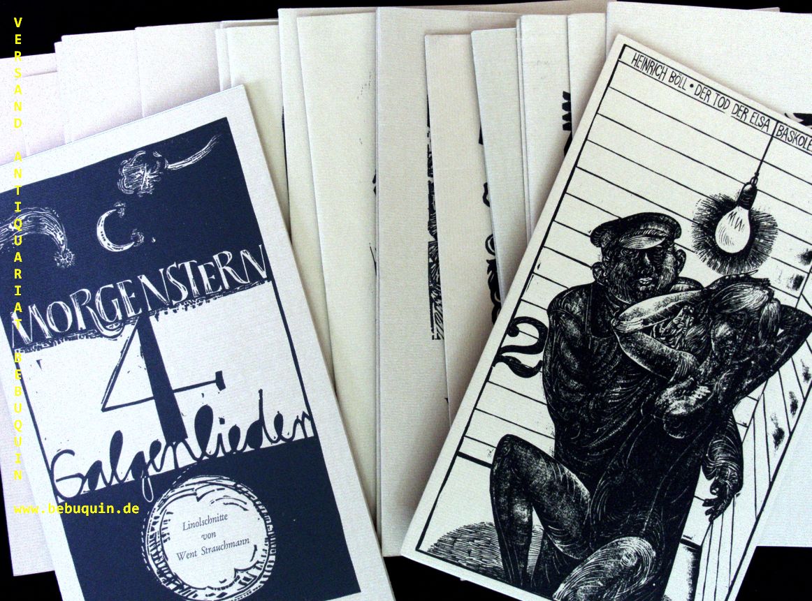 ILLUSTRATION 63: 21 von 24 Sonderdrucken. 1. Vergils Aeneis mit 5 (1 signierte) Original-Holzschnitte von Helmut Ackermann. 2. Reineke Fuchs mit 4 (1 signierte) Original-Holzschnitte von Went Strauchmann. 3. Lob des Landlebens mit 4 Original-Holzschnitte von Gottfried Teuber. 4. Der Leopard mit 5 (1 signierte) Original-Holzschnitte von Klaus Eberlein. 6. Der Fremdling in Memel mit 4 (1 signierte) Original-Holzschnitte von Archibald Bajorat. 7. Westöstlicher Divan mit 4 (1 signierte) Original-Holzschnitte von Robert Kirchner und Nr. 57 von 300 Ex. 8. Walpurgisnacht mit 4 (1 signierte) Original-Holzschnitte von Benno Huth. 10. Dekameron mit 4 (1 signierte) Original-Holzschnitte von Jiri Altmann. 11. Severins Abenteuer mit mit 4 (1 signierte) Original-Holzschnitte von Helmut Ackermann. 13. Heinrich Böll: Der Tod der Elsa Baskoleit mit mit 2 (1 signierte mit Holzstich-Signatur) Original-Holzschnitte von Karl-Georg Hirsch. EA WG² 106. 14. Regenbogen mit mit 4 (1 signierte) Original-Holzschnitte von Otto Schlosser. 15. Galgenlieder mit mit 5 (1 signierte) Original-Holzschnitte von Went Strauchmann. 16. Der Berg stürzt mit mit 4 (1 signierte) Original-Holzschnitte von Alfred Pohl. 17. Verkündigung mit mit 6 (1 signierte) Original-Holzschnitte von Klaus Eberlein. 18. Gullivers Reisen mit mit 4 (1 signierte) Original-Linolschnitten von Hermet Ripé. 19. Skizzen von Georg Heym mit mit mit 5 farb. (1 signierte) Original-Linolschnitte von Eva raupp-Schliemann. 20. Pauls Frau mit mit 4 (1 signierte) Original-Linolschnitte von Jan Prein. 21. Trillers Affe mit mit 3 Original-Linolschnitte von Eduard Preussen am Ende eigenhändig vom Künstler signiert. 22. Entremos en las cosas mit mit 4 (1 signierte) Original-Holzschnitte von Alfred Pohl. 23. Traum des Pelegrin mit mit 6 (1 signierte) farb. Original-Linolschnitte von Wolfgang Huss. 24. Goethes Märchen mit mit 4 (1 signierte) farb. Original-Linolschnitte von Gottfried Teuber. 21 Bände. Memmingen/Allgäu, Visel, 1966 ff. jeweils 4 Bl. mit teils eigenhändig signierten Originalstichen. ill. OKart. fast neuwertig. jeweils 1 von 400 oder 300 Ex. der EA. In solcher Fülle höchst selten angeboten.