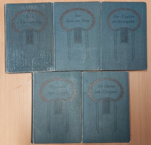 MAY.– (MAY, Karl): Die Liebe des Ulanen. Roman aus der Zeit des Deutsch-Französischen Krieges. Bd. 1 – Die Herren von Königsau, 600 S, 49 Ill. Bd. 2 – Napoleons lezte Liebe, 586 S, 40 Ill. Bd. 3 – Der Kapitän der Kaisergarde, 556 S, 27 Ill Bd. 4 – Der Spion von Ortry, 602 S, 27 Ill Bd. 5 – Durch Kampf zum Sieg, 541 S, 39 Ill. Neue illustrierte Ausgabe. 5 Bände. (komplett). Niedersedlitz-Dresden (Münchmeyer), ca 1908. ca 3000 S. mit über 200 Ill. ill. OLn. (DB 123). Einbände teils etwas geblichen, Vorsätze gebräunt, ein Vorsatz mit Abschnitt, NaV, insgesamt von guter Erhaltung. Sehr seltene anonym erschienene letzte Ausgabe zu Lebzeiten, genannt: Band – Ausgabe. Plaul 445.1.