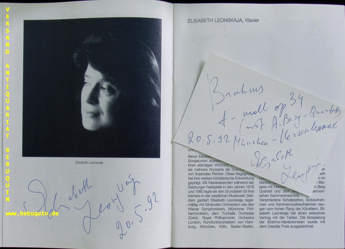 ALBAN BERG QUARTETT + LEONSKAJA, Elisabeth (Pianistin) + POSCH, Alois (Bassist): ABQ sind: Günter Pichler, Gerhard Schulz, Thomas Kakuska, Valentin Erben. Programmheft mit den eigenhändigen Signatur aller Beteiligten an ihren Portraitfotos. München (Herkulessaal), 20.5.1992. 16 S. mit zahlr. Abb. + 4 (!) eigenhändig datierte und signierte Karteikarte der Beteiligten einzeln und in Gruppen vom gleichen Termin beiliegend. OKart. gutes Ex. Das Alban Berg Quartett war eines der weltweit führenden Streichquartette. (Wikipedia)