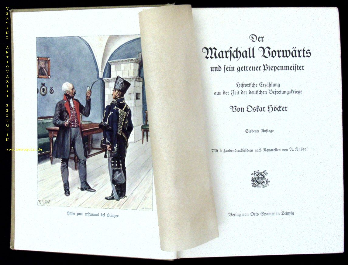 HÖCKER, Oskar: Der Marschall Vorwärts und sein getreuer Piepenmeister. Historische Erzählung aus der zeit der deutschen Befreiungskriege. 7. Aufl. Leipzig (Spamer), nach 1910. Gr. 8°. 350 (2) S. mit 8 Farbendruckbildern bach Aquarellen von R. Knötel. ill. OLn. etwas schief gelesebn. Klotz 2729/113.