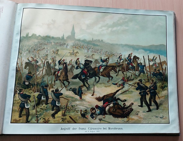 MAY.– DITTRICH, Max: Der Deutsch-Französische Krieg 1870 und 1871. Dresden (Münchmeyer), 1889. 44 x 56 cm. 1 Bl., 86 S. mit 26 (davon 24 farb.) lithogr. Tafeln in Öldruck von Max Henze sowie zahlr. Textholzst. Oln. mit Blind- und Schwarzprägung in OSchuber. fliegende Vorsätze lose und lädiert, Schuber stärker lädiert, kleiner Braunfleck am unteren Schnitt, sonst von feinster farbstarker Erhaltung mit nahezu jungfräulichen Farbtafeln. EA mit allen Tafeln. Die Tafeln ganz im Stile eines Volksbuches in kräftigen Farben gehalten, zeigen die wichtigsten Schlachten des Krieges meist mit Hintergrundansichten: Erstürmung des Gaisberges./ Reiterangriff bei Reichshofen. / Angriff d. franz. Cürassire bei Morsbrunn./ Erstürmung der Spicherer Höhen./ Reitergefecht bei Buzancy./ Waldkampf bei Sedan./ Reiterangriff bei Sedan./ Schlacht bei Artenay. / Erstürmung von Orleans./ Gefecht bei Raon l’ Etape./ Erstürmung von Chateaudun./ Erstürmung von Le Bourget./ Beschiessung von Strassburg./ Schlacht bei Champigny./ Schlacht bei Monbeliard./ Schlacht bei St. Quentin./ Uebergang Bourbaki’s in die Schweiz./ Truppeneinzug in Dresden am 11. Juli 1871 (ganzseitiger Holzstich)./ Das Nationaldenkmal auf dem Niederwald. (s/w) / Einzug in Berlin (s/w)./ König Wilhelm von Preussen u. sein Generalstab (s/w)./ Schlacht bei Beaumont./ Reitergefecht bei Mars la Tour./ König Wilhelm bei Rezonville./ Sturm auf St. Privat./ Uebergabe von Metz./ Erstürmung von Dijon./ Einzug in Paris am 1. März 1871. Der Freund und Knastkumpan Karl Mays, Julius Eduard Maximilian Dittrich (10.6.1844 – 10.5.1917) war Hauslehrer, Journalist und ab 1870 Redakteur verschiedener Zeitungen in Dresden. Da der frühere kaufmännische Angestellte vom 13.7.1866 – 13.1.1868 wegen Betrugs und Unterschlagung in Schloss Osterstein inhaftiert war, kannten sich May und Dittrich vermutlich bereits aus dieser Zeit. (May sass ab 14.6.1865 ebendort ein.) Da Dittrich zur selben Zeit wie May in Schloss Osterstein war, kannten sie sich vermutlich bereits aus dieser Zeit. Dittrich erklärte dazu am 25. November 1908: „Es ist richtig, daß ich May das erste Mal in Schloß Osterstein in Zwickau gesehen habe, und zwar im Jahre 1866. Gesprochen habe ich ihn damals aber nicht.″