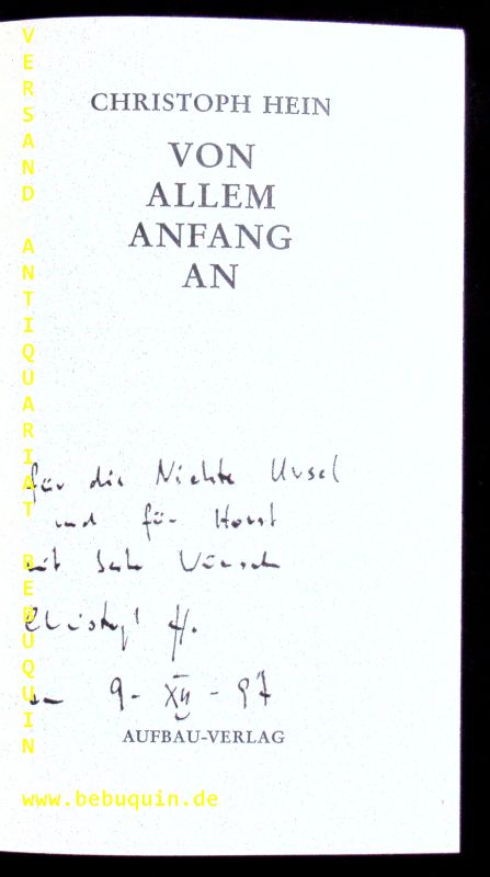 HEIN, Christoph: Von allem Anfang an. 3. Aufl. Berlin (Aufbau), 1997. 199 S. OPb mit OUmschl. tadellos. Mit einer 5zeiligen eigenhändigen persönlichen signierten und datierten Verfasserwidmung auf Titelseite.