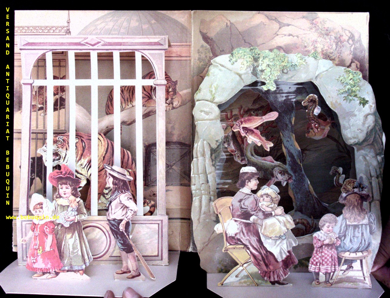 AUFSTELLBILDERBÜCHER.– EN DAG I DJURPARKEN.– En nyutgava av en antik „vik-ut“ bok. Schweden (Barnens), o.J. 4°. 8 Bl. mit 6 farb-Aufstellpanoramen. farb. ill. OKart. aufwendig gestaltetes dreidimensionales Bilderbuch. Im Stil des 19. Jahrhunderts.