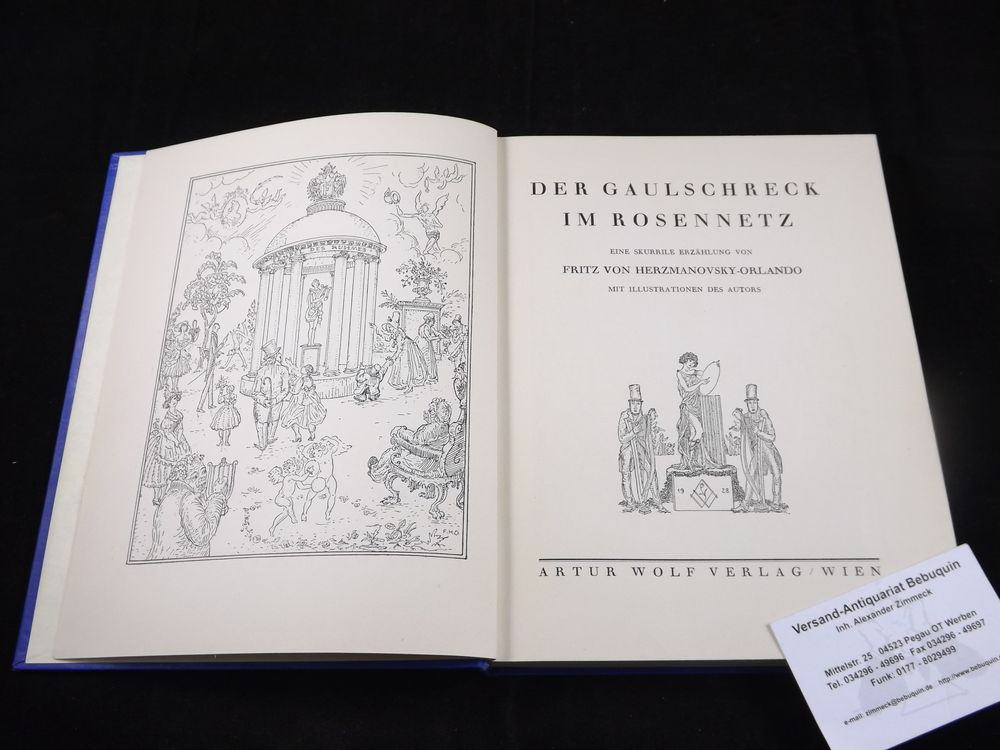 HERZMANOVSKY-ORLANDO, Fritz von: Der Gaulschreck im Rosennetz. Eine skurrile Erzählung. Wien (Artur Wolf), 1928. Gr. 8°. 115 (1) S. mit Titelvignette und 23 (11 ganzseitigen) Illustrationen des Autors. OLn. mit goldgeprägtem Schmetterling. feines Ex. EA des Erstlingswerks WG² 1.