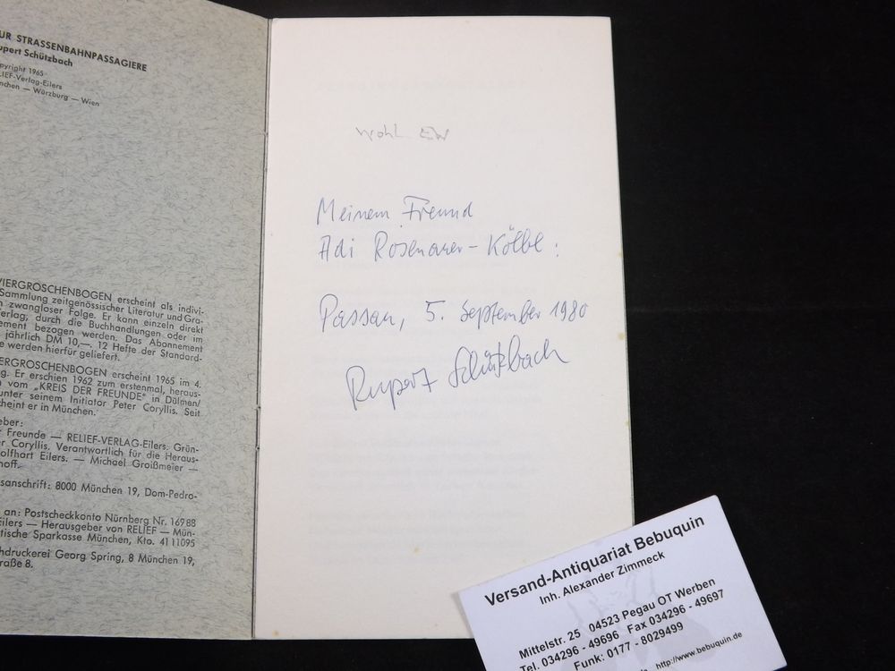 SCHÜTZBACH, Rupert: Für Straßenbahn-Passagiere. Gedichte. München (Relief), 1965. 12 S. OKart. = Viergroschenbogen Folge 59. EA des Erstlings mit eigenhändiger, datierter Widmung auf Vorsatz.